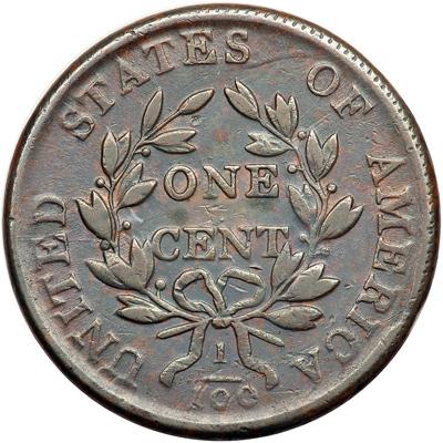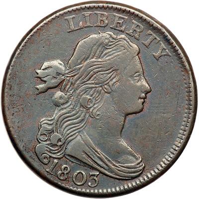 1803 S-252 R3-. VF-25. Five points sharper but lightly cleaned and retoned glossy dark steel and reddish chocolate brown. Frosty flowline luster shows in protected areas of the reverse. The notable marks are a trail of very tiny pinpricks from the throat across to the curl under the hair ribbon and a light rim bruise at RT in LIBERTY. MDS, Breen state V, with a fine die crack arcing from the dentils through the E in UNITED to the dentils over the O in OF. DWH #3090.