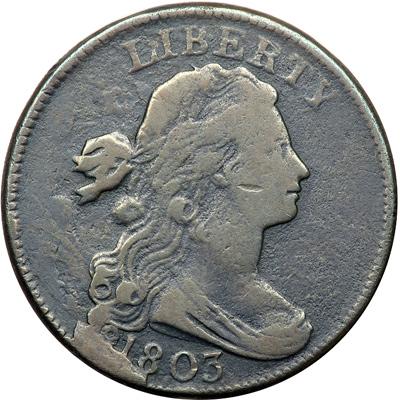 1803 S-252 R3-. VG-8. A couple points sharper with very fine roughness under a rather glossy dark steel brown patina, the highpoints a few shades lighter than the protected areas. No verdigris, and a light horizontal nick on the cheek left of the mouth is the only contact mark. Very rare LDS, Breen state VIII, with a strong cud break at the 18 and lowest curl. DWH #2664.