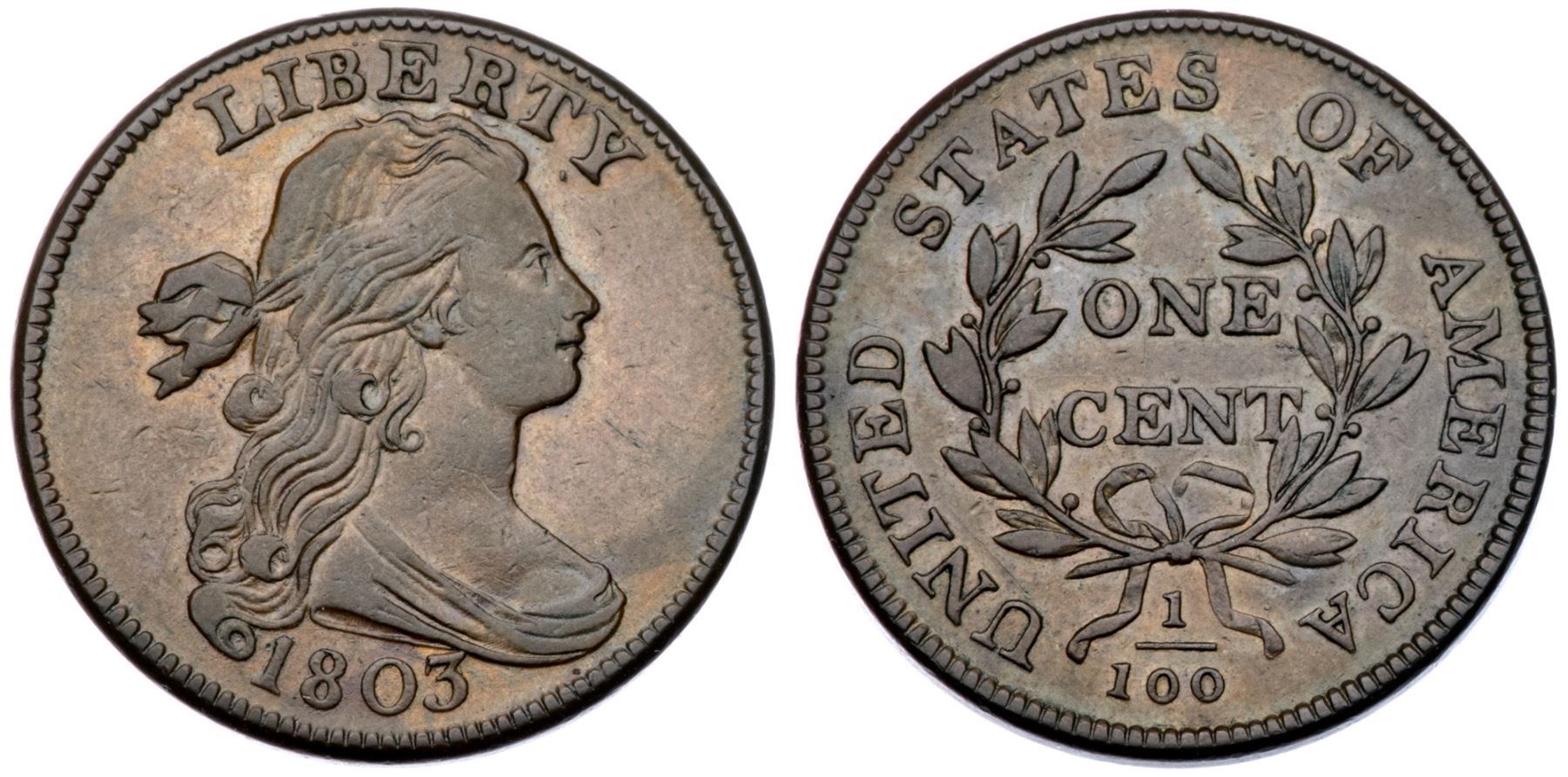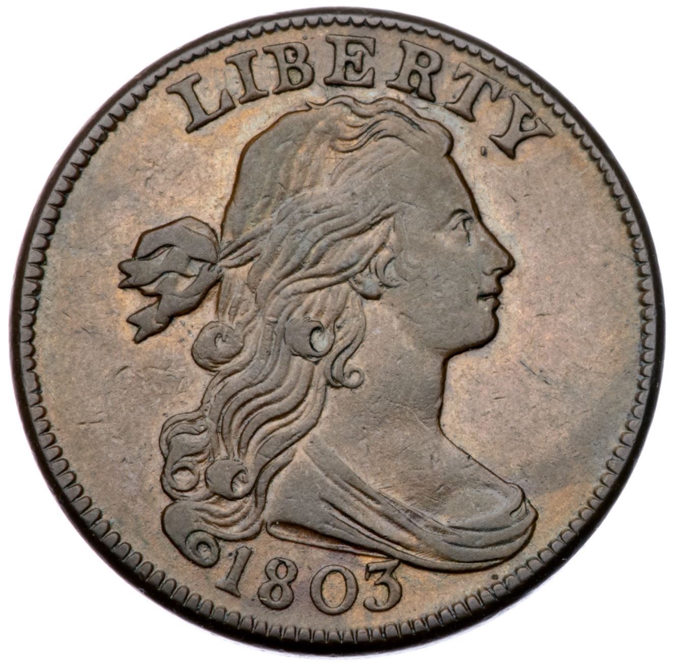 1803 S-254 R-1 VF35Glossy light olive and chocolate with light brown and tan in protected areas on the obverse. The only notable mark is a very light scratch under UNIT. E-MDS, Breen state II early, with clashmarks and very light die cracks on both sides.Certificate Number: Pedigree: Ex George Ramont-Fred H. Borcherdt Collection (includes the Ramont collection envelope)