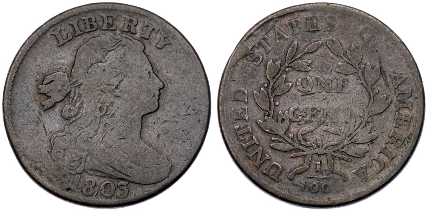 1803 S-255 R-1 VG7Slightly sharper with smooth, attractive surfaces for the grade, but there are some contact marks including a significant nick under the first A in AMERICA. Glossy uniform light olive. LDS, Breen state IV early, with an incomplete cud break over STA. This is the only example seen with an incomplete cud. It may be partial due to an incomplete planchet, or it may be an intermediate die state. Regardless this is the only example known to us. Graded VG8 net VG7 by Noyes, his photo #34201.Certificate Number: Pedigree: Ex William "Billy" Paul (American Heritage Minting) as a gift-Fred H. Borcherdt Collection
