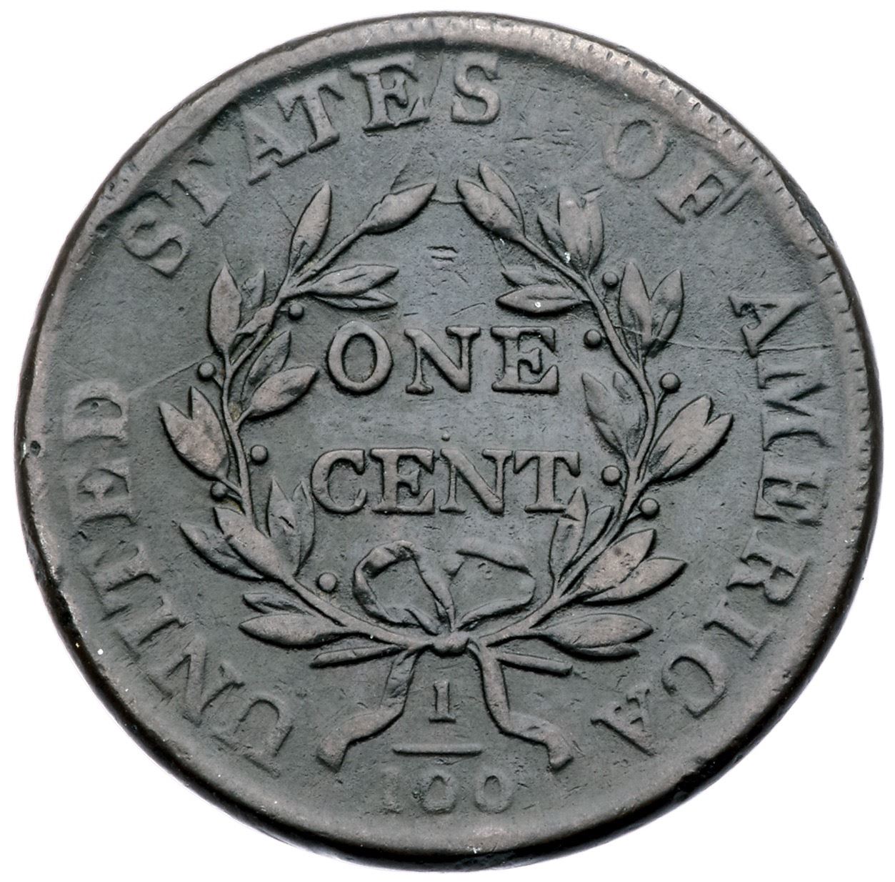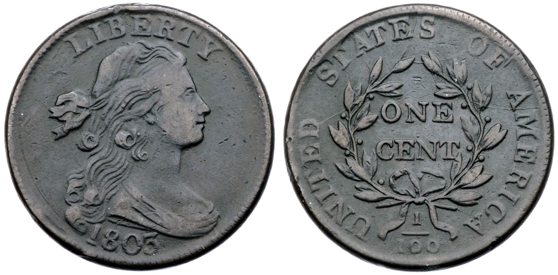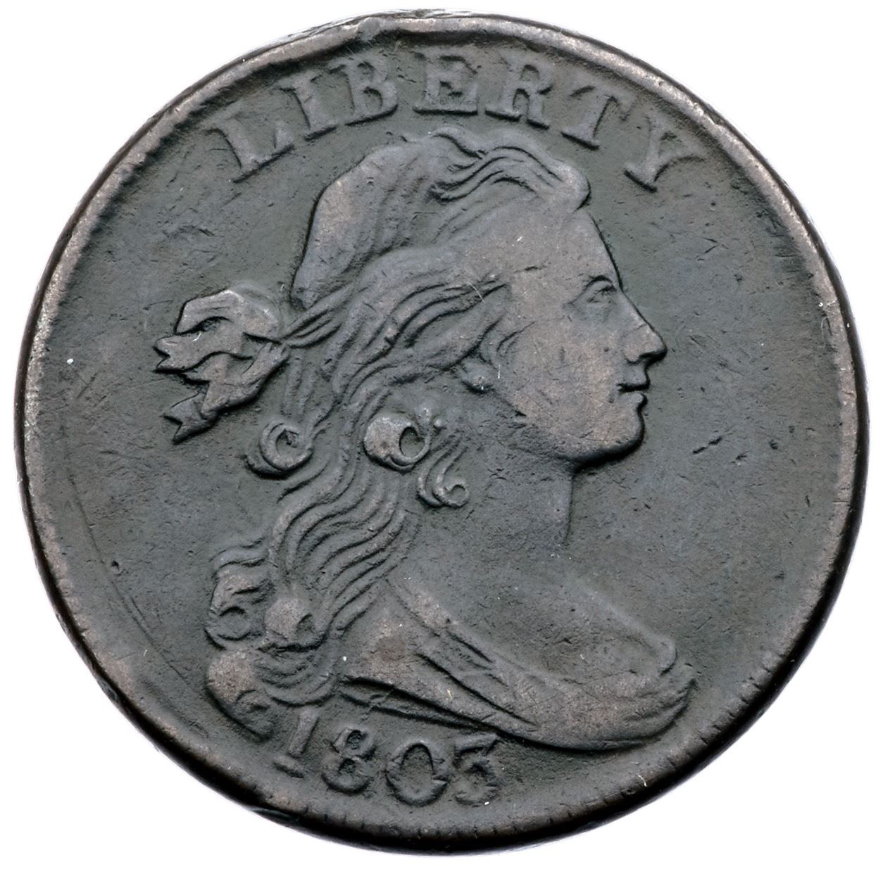 1803 S-256 R-3 F15+Five points sharper but there are several minor rim bumps. The most notable are under 1, above IB in LIBERTY, below the fraction, and at CA in AMERICA. Smooth, hard surfaces. Rather glossy dark olive and steel browns, a shade or two lighter on some high points. LDS, Breen state VI, with a reverse rim break at STA.