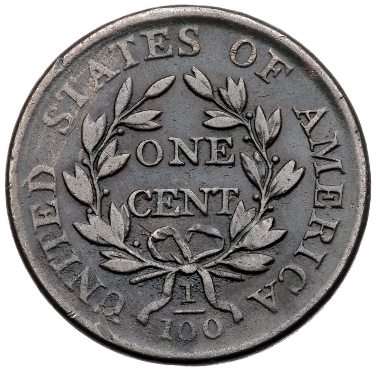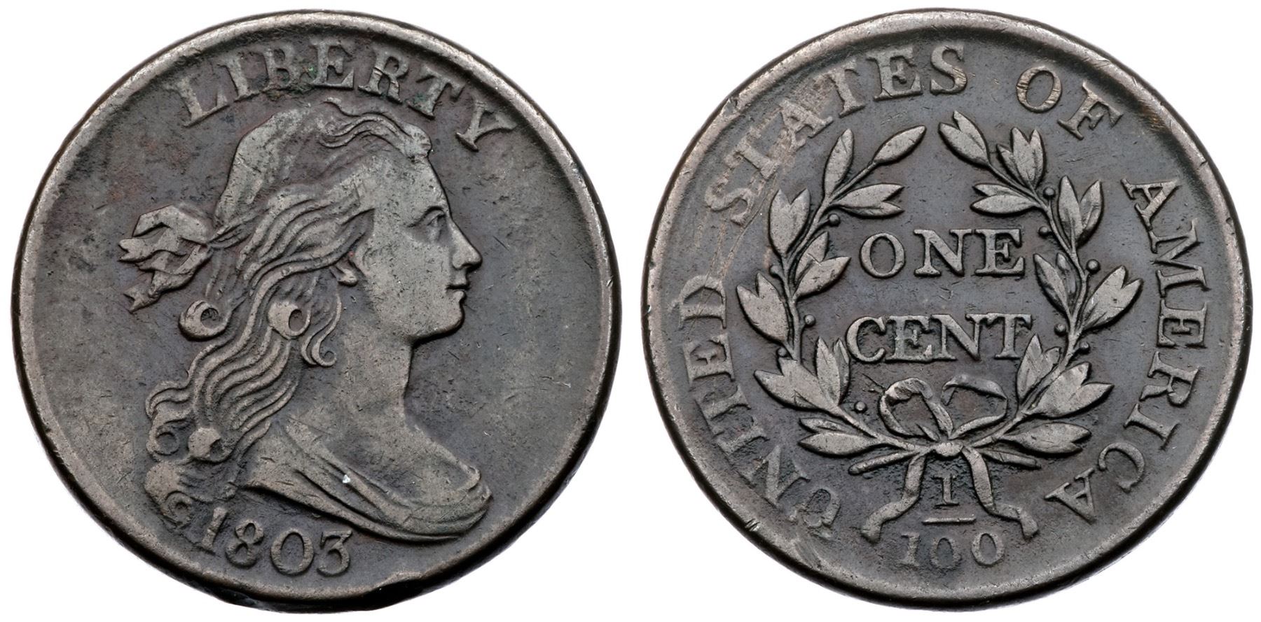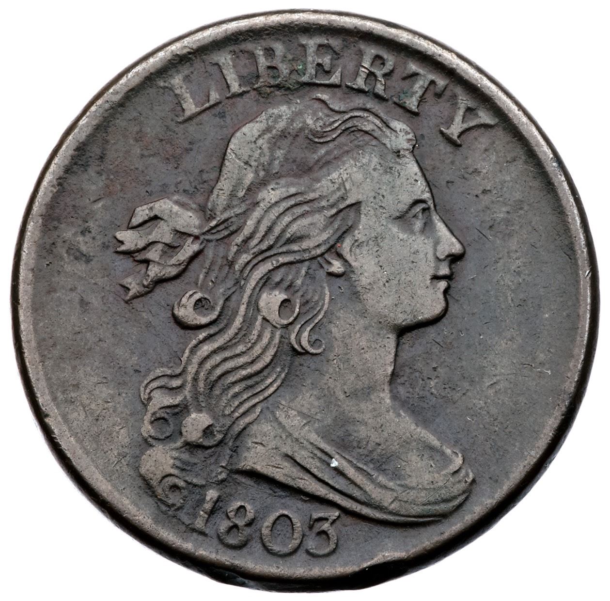 1803 S-258 R-1 F12VF20 sharpness but there are several scratches across TED-STA and a spot of verdigris at BE iN LIBERTY. The only other marks are a rim bruise right of the date and a bit of grainy crud in some reverse protected areas around the lower wreath. Otherwise mostly olive brown with deeper maroon outlining the devices. M-LDS, Breen state III.Ex; E.E. Hattin 7/29/1966