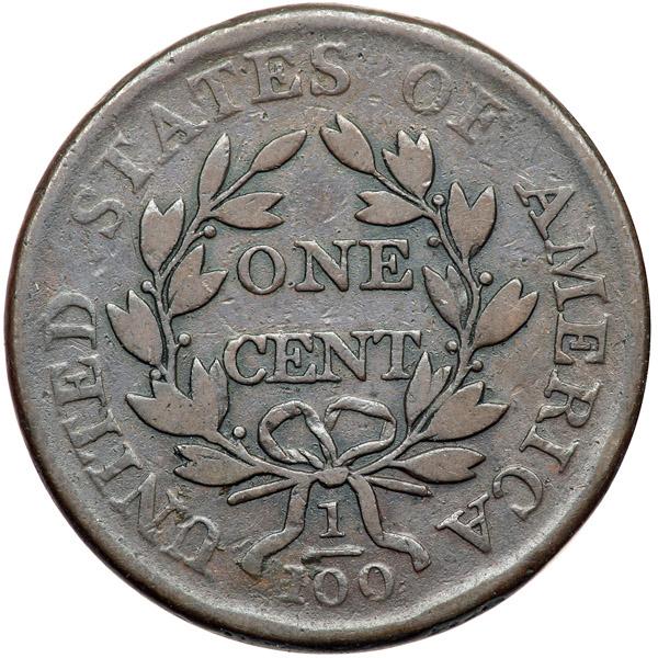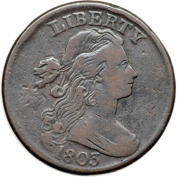 1803 S-258 R1 Large Fraction VG10. Glossy chocolate brown and steel. Smooth surfaces with only a few minor marks consistent with the grade. The notable ones are a very light rim bruise left of the L in LIBERTY and another right of the fraction. MDS, Breen state III, with a die crack arcing through the lower curls into the field at the bottom of the hair ribbon. The date and legends are strong.