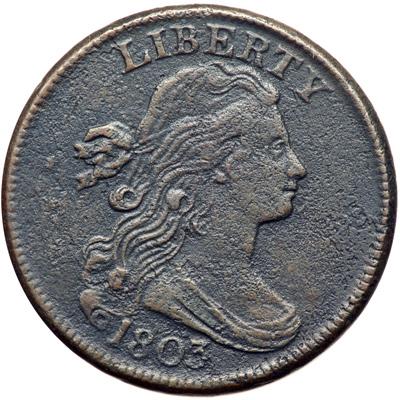 1803 S-258 R1. VG-10. Large Fraction. Sharpness EF40 but covered with uniform fine to moderate granularity. No marks or verdigris. The date and devices are bold. Dark steel and olive brown with lighter steel and olive toning on the highpoints.