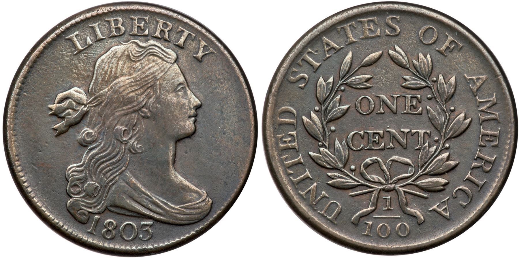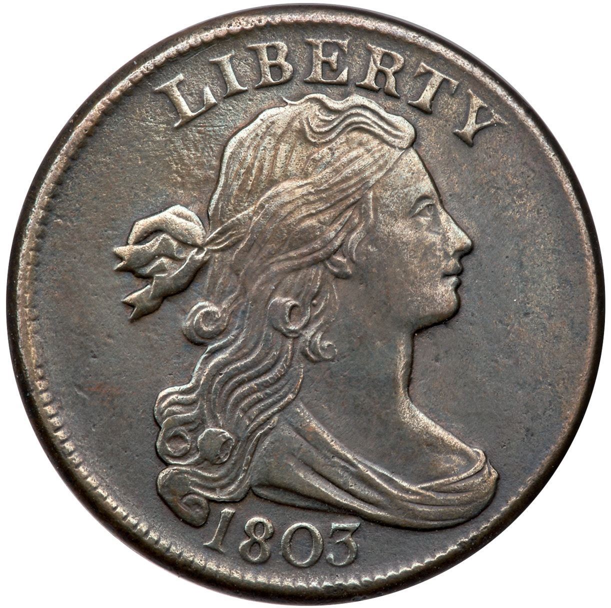 1803 S-260 R-1 Large Fraction VF25XF40 sharpness but cleaned and now toned medium to dark olive and steel tones. There are a few wispy pin scratches that blend in well on the portrait, otherwise free of notable marks and verdigris.Certificate Number: Pedigree: Ex; Tim Paquette