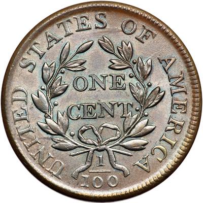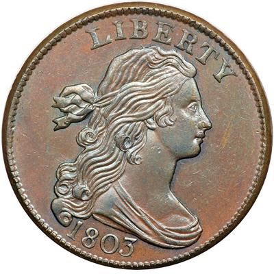 1803 S-260 R1 Large Fraction. MS-60. Prooflike Obverse. Choice lustrous medium brown and light chocolate with hints of light bluish steel overtone in protected areas. No spots or stains, and the only marks are a barely visible tick or planchet flake on the nostril, a couple microscopic marks on the cheek, and a few more high on the neck. None of these marks is visible without the aid of a strong glass and the eye appeal of this cent is outstanding. EDS, Breen state II. The obverse fields are prooflike offering nicely reflective surfaces thanks to a fresh die polishing following the earlier S-259 marriage. Many of the fine die polishing lines remain clearly visible in those fields. The reverse is highly lustrous and virtually flawless. A choice cent in every respect. Called MS60 and tied for CC#2 in the Bland census. Noyes has this piece listed as AU55 net EF45 and tied for CC#8, his photo #58145. (This pair of Noyes photos is of relatively poor quality, which may explain why the grades he assigned based on those photos are so far out of line.) Removed from a PCGS slab graded MS63BN (PCGS label included). DWH #3552.