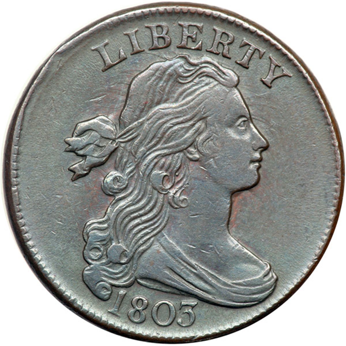 1803 S-260 R1 Large Fraction VF35. Five points sharper but lightly cleaned and nicely retoned glossy chocolate brown with overtones of light bluish steel. Faint hints of lighter reddish brown toning show in a couple places around the portrait. The surfaces are smooth and very attractive, nearly flawless. The best identifying mark is a tiny planchet void on the rim left of the L in LIBERTY, as struck. M-LDS, Breen state III.