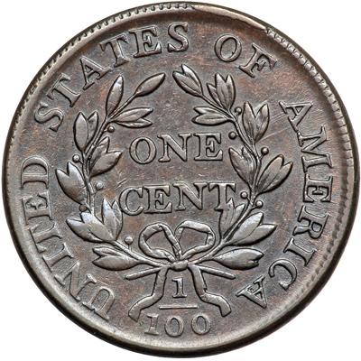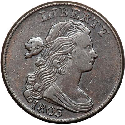 1803 S-260 R1 Large Fraction. VF-35. Choice glossy steel brown and chocolate with traces of satiny mint frost remaining in protected areas. The only marks are a light diagonal nick in the center of the neck and another in the field before the neck. MDS, Breen state IV, with a clear and relatively strong rim cud break at S-OF. The only example known to this cataloger showing the rim cud. Called VF35 choice and tied for CC#19 by Noyes, his photo #21039. A beautiful example of a common die variety, which may explain why several "advanced" collectors of large cents once owned this coin. DWH #2842.