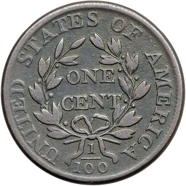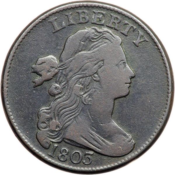 1803 S-260 R1 Small Date, Large Fraction. Fine-12. Slightly sharper but covered with extremely fine roughness and there is some microscopic verdigris dusted into the protected areas. The only mark is a thin, light diagonal nick high on the shoulder. Partly glossy dark olive and steel. E-MDS, Breen state II.