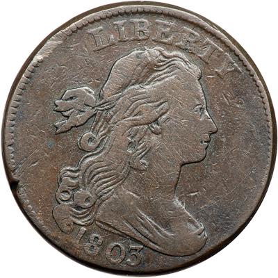 1803 S-262 R3 Small Fraction. VG-8 Plus. Sharpness F12 with too many light contact marks for the sharpness grade, including very light hairline scratches covering the highpoints on both sides and a relatively strong nick or planchet chip on the rim left of the lower curls. Glossy chocolate brown. The date and legends are complete and clear. Extremely rare TDS, Breen state III, with a sunken retained cud break at STAT. Called F15 net VG10 and finest of the terminal die state in the Noyes census, his photo #36168. DWH #2843.