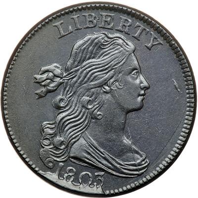 1803 S-263 R3 Small Fraction. AU-55. Plated in Newcomb, Early American Cents, Penny Whimsy, Noyes, and Breen. Mint state sharpness but the toning is a dark for a mint state cent. The eye appeal is still quite nice, and the surfaces are a satiny, lustrous uniform dark olive and steel with only a few microscopic marks. A small pinprick between the B & E in LIBERTY and another over that I are the only signs of contact. The only evidence of corrosion is small pitmark at the dentils over the right side of the A in STATES, and this defect is barely visible. LDS, Breen state VII, with a strong cud break connecting the date to the rim below and a fine die crack from the second T in STATES to the leaf below. An arc die crack at the top of the reverse outlines where the retained cud is forming for this die’s use during its more famous S-264 marriage. Both sides are plated to represent the variety in the Newcomb book on the cents of 1801-1803, Early American Cents, Penny Whimsy, Noyes, and Walter Breen’s Encyclopedia of Early United States Cents 1793-1814. In other words, virtually every significant work on the series used this cent to illustrate the variety. Graded MS60 and CC#1 in the Bland census. Noyes says MS60 net AU50 and tied for CC#1, his photo #23292. Removed from a PCGS slab graded AU58 (PCGS label included, and it shows the attribution and Husak provenance). PCGS Population 1; The only example graded at Pcgs for vsriety DWH #3496.