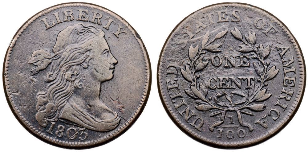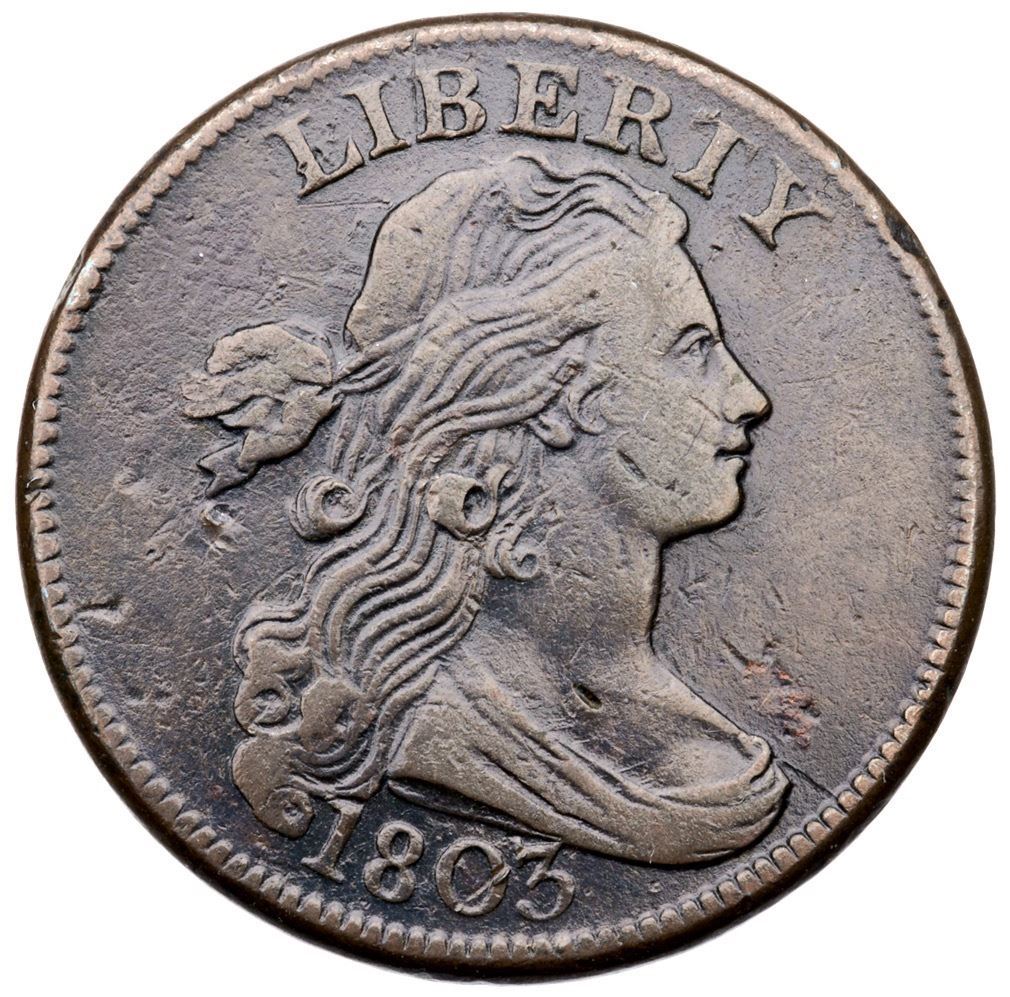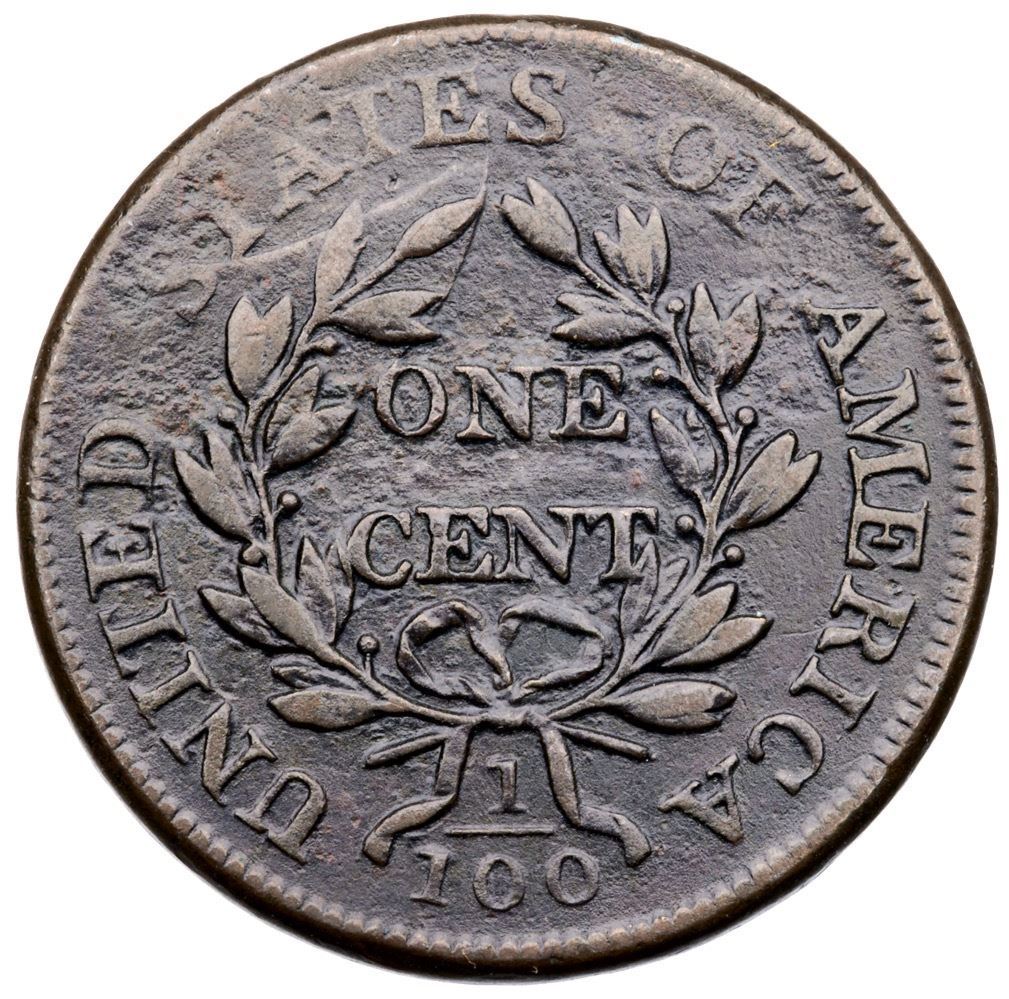 Sharpness VF20 but there is a small patch of fine roughness in the field over the bust, a dull nick under the end of the hair ribbon, and uneven roughness covering the upper half of the reverse. The roughness is somewhat hidden under the glossy olive brown toning that varies from steel brown on the devices to dark brown in protected areas. MDS, Breen state IV, with a fine die crack from the bust tip to the dentils and stronger cracks at and below STATE. A decent example of this popular "Redbook" variety. Ex Chris McCawley 1/2012-William R Eckberg, McCawley & Grellman Auctions/Goldbergs 5/31/2015:220 (lot ticket included)