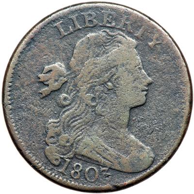1803 S-265 R4. VG-8. Large Date and Fraction. Slightly sharper but covered with fine granularity, strongest in the obverse fields. No verdigris and only a couple light contact marks, including a hairline scratch across the upper part of the neck and a dull rim nick under the right edge of the 3 in the date. Slightly glossy olive and chocolate brown. MDS. The date and legends are complete and easily readable.