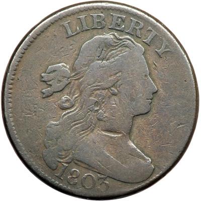 1803 S-265 R4. VG-8. Large Date and Fraction. Glossy steel and chocolate brown. A dull horizontal nick on the neck is the only mark on otherwise smooth, attractive surfaces. LDS, Breen state III. Die cracks and swelling have severely weakened STAT, but the date and remainder of the legend remain strong.