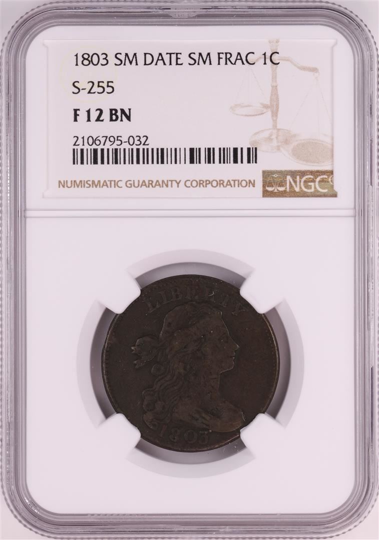 One 1803 Small Date S-255 Draped Bust Large Cent Coin NGC F12 BN. NGC Certified.
