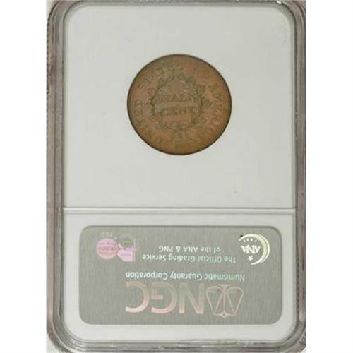 <B>1804 1/2 C Crosslet 4, No Stems MS62 Brown NGC.</B></I> C-12, B-11, R.2. Though the surfaces of this attractive half cent are predominantly nutmeg-brown, both sides display significant undercurrents of reddish-orange. Pleasingly detailed with a grade-defining vertical abrasion to the right of the Y in LIBERTY. EAC 60.<BR><I>From The Beau Clerc Collection.</B></I><BR><BR><B>Coin Engraver:</B> Robert Scot<BR><BR><b>Shipping:</b> Coins & Currency (<a target="_blank" href="http://www.heritageauctions.com/common/shipping.php">view shipping information</a>)