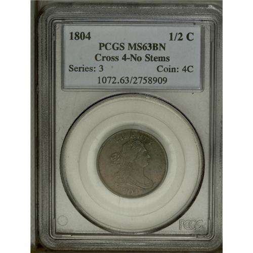 1804 1/2 C Crosslet 4, No Stems MS63 Brown PCGS. C-12,