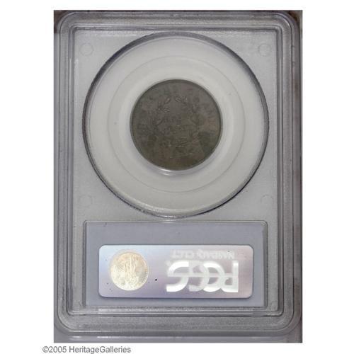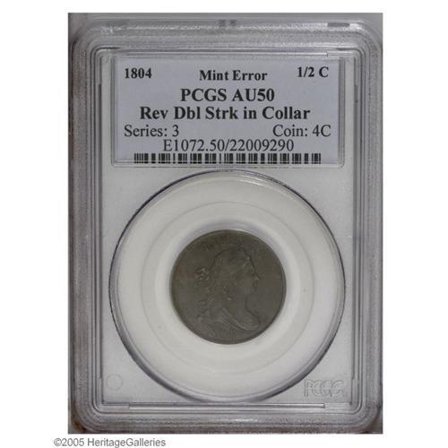 <B>1804<1/2 C> Crosslet 4, No Stems--Reverse Double Struck in Collar--AU50 PCGS.</B></I> B-11, C-12, R.2. Struck twice by the dies, the reverse die shifted a degree or two to the left between blows from the dies. No doubling is present on the obverse, while the reverse displays a slender but dramatic east-west shift. A sharply detailed deep brown example with somewhat lighter golden-brown color on the reverse. Areas of granular surface are noted on both sides.