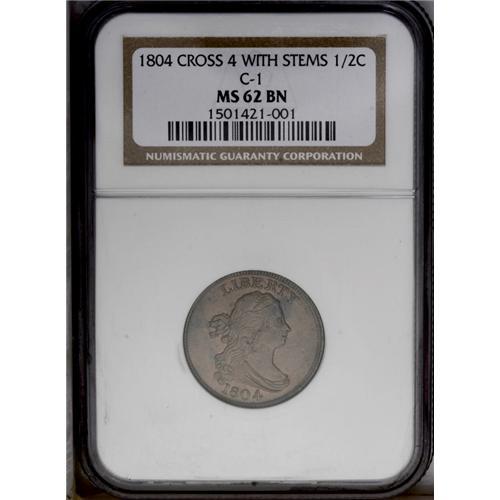 1804 1/2 C Crosslet 4, Stems MS62 Brown NGC. C-9, B-8,