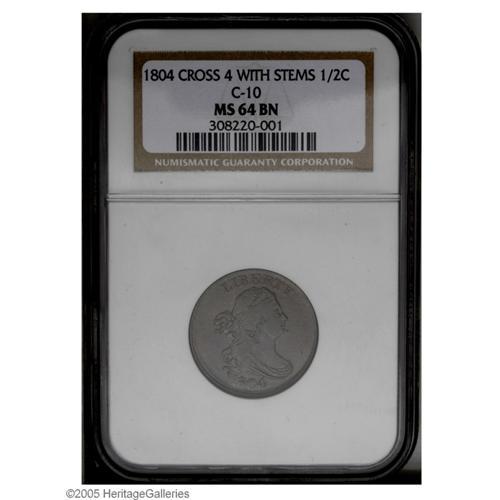 1804 1/2 C Crosslet 4, Stems MS64 Brown NGC. B-9, C-10 1804[1/2 C] Crosslet 4, Stems MS64 Brown NGC.