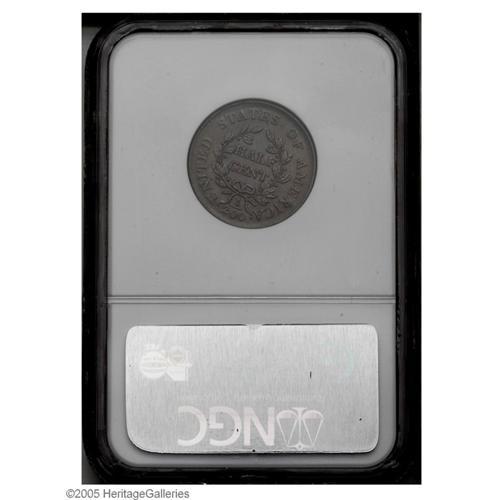 <B>1804<1/2 C> Crosslet 4, Stems MS64 Brown NGC.</B></I> B-9, C-10, R.1. Manley Die State 3.0. Boldly struck aside from the denticles, which are always weak with this later die state. Glimmers of faded red color are noted on both sides, although deep and consistent chocolate-brown patina consumes most of both sides. About 20 degrees of clockwise die rotation is noted. Refreshingly undisturbed, and worthy of close inspection from the enthusiast of early American copper.