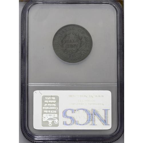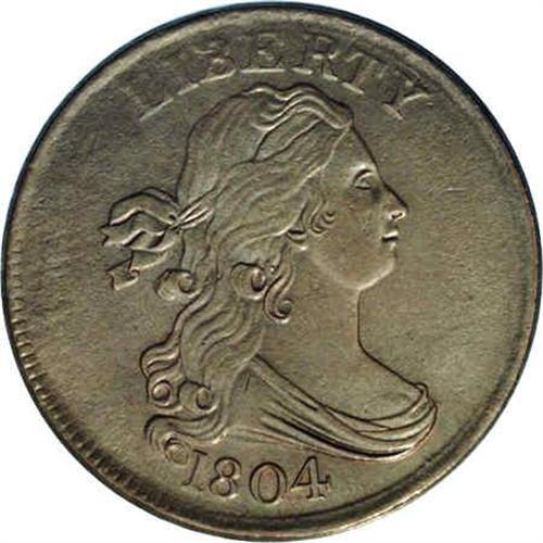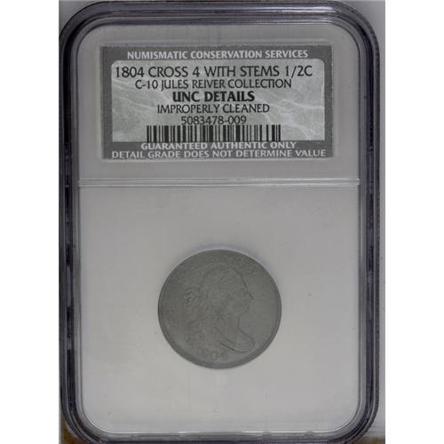 <B>1804<1/2 C> Crosslet 4, With Stems. C-10, B-9, R.1. Die State 3--Improperly Cleaned--NCS. Unc Details. XF45 EAC.</B></I> Close date, 4 high, upright; Close fraction, ridge at R. The most common of the 1804 Crosslet 4 varieties, and an excellent choice for date or type collectors. The surfaces on both sides are greenish-brown with later orange color and slightly granular fields. Compounding the matter are the late state of the dies with extensive die rust and heavy radial flowlines. Both sides exhibit strong central details.<BR><I>Ex: B. Max Mehl (1941); Harold Bareford; William Bareford (5/25/1984).</B></I> Envelope Included.