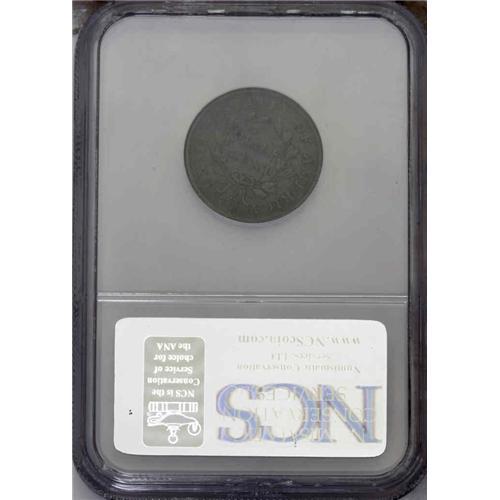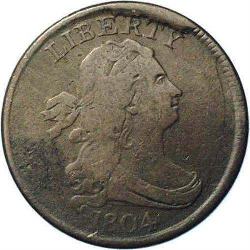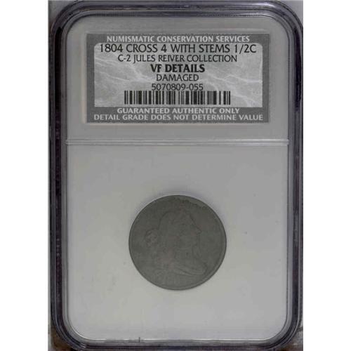 <B>1804<1/2 C> Crosslet 4, With Stems. C-2, B-3, High R.6. Die State 3--Damaged--NCS. VF Details. VG8 EAC.</B></I> Low 4, leans left; Close fraction, 00 joined. This variety was unknown to Gilbert, and was actually first discovered by Howard Hazelcorn as reported in the May 1968 issue of <I>Penny Wise.</B></I> A second example had been discovered by 1971, and four more by November 1977. Several more have been found since, and today this variety is considered High R.6 with possibly 15 or 16 examples known. This example is the latest of those known with the heavy rim break extending from the right top of E to the right top of Y. The additional obverse die crack is fully extended. Inexplicably graded AG3 in the Cohen catalog. Although we don't believe this coin has VF details as recorded by NCS, it is clearly finer than AG3, in our opinion. Perhaps VG8 is an appropriate compromise. Splendid olive-brown color with minor corrosion at the lower left obverse and a few hidden marks on the reverse, prompting the Damaged designation by NCS. Echoing the sentiments of the cataloger for Superior: "A coin for the connoisseur that has waited too long to find one unattributed."<BR><I>Ex: Ed Antz; Roger S. Cohen, Jr. (Superior, 2/1992), lot 142.</B></I> Envelope Included.