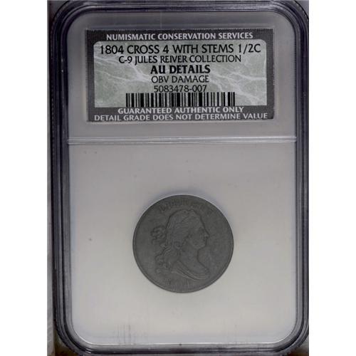 <B>1804<1/2 C> Crosslet 4, With Stems. C-9, B-8, R.2. Die State 1--Obverse Damage--NCS. AU Details. VF35 EAC.</B></I> Wide date, 4 centered; Close fraction, ridge at R. Obverse die cracks through LIBERTY are present but extremely faint. Reverse clash marks are visible as always. Apparently the accident creating these clash marks happened during the first few coins struck, or perhaps during setup, as no examples are known without these marks. However, the latest states of Cohen-8 do not show any clash marks, thus these are exclusive to the C-9 die marriage. Chestnut-brown surfaces have splashes of darker bluish toning on the obverse. The reverse is lighter in appearance and suggests that this example may have been cleaned and recolored at some time in the past. The obverse defects mentioned by NCS are nothing more than a few minor scratches that are now blended with the rest of the coin.<BR><I>Ex: George Ramont (9/1967).</B></I> Envelope Included.