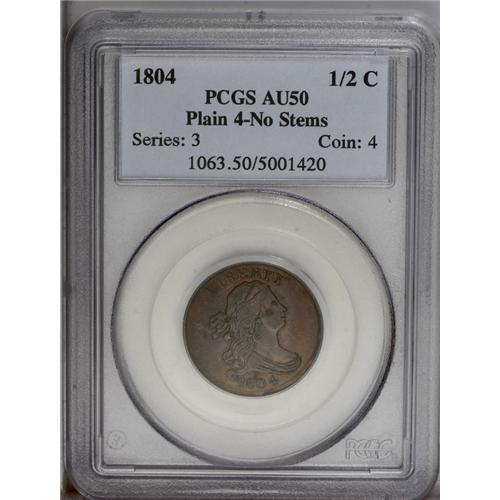 1804 1/2 C Plain 4, No Stems AU50 PCGS. C-13, B-10, R.