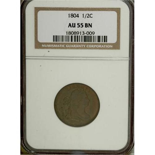 <B>1804 1/2 C Plain 4, No Stems AU55 NGC.</B></I> NGC Census: (63/327). PCGS Population (57/156). Mintage: 1,055,312. Numismedia Wsl. Price for NGC/PCGS coin in AU55: $550. (#1063)<BR><BR><B>Coin Engraver:</B> Robert Scot<BR><BR><b>Shipping:</b> Coins & Currency (<a target="_blank" href="http://www.heritageauctions.com/common/shipping.php">view shipping information</a>)