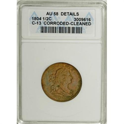<B>1804 1/2 C Plain 4, No Stems--Cleaned, Corroded--ANACS. AU58 Details.</B></I> C-13. NGC Census: (150/174). PCGS Population (47/104). Mintage: 1,055,312. Numismedia Wsl. Price for NGC/PCGS coin in AU58: $620. (#1063)<BR><BR><B>Coin Engraver:</B> Robert Scot<BR><BR><b>Shipping:</b> Coins & Currency (<a target="_blank" href="http://www.heritageauctions.com/common/shipping.php">view shipping information</a>)