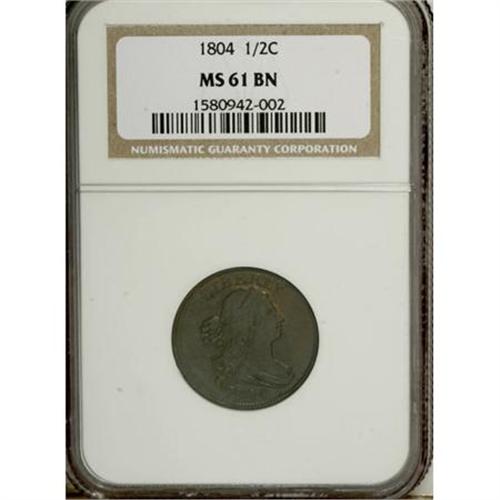 <B>1804 1/2 C Plain 4, No Stems MS61 Brown NGC.</B></I> NGC Census: (27/144). PCGS Population (7/88). Mintage: 1,055,312. Numismedia Wsl. Price for NGC/PCGS coin in MS61: $825. (#1063)<BR><BR><B>Coin Engraver:</B> Robert Scot<BR><BR><b>Shipping:</b> Coins & Currency (<a target="_blank" href="http://www.heritageauctions.com/common/shipping.php">view shipping information</a>)