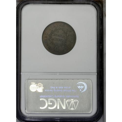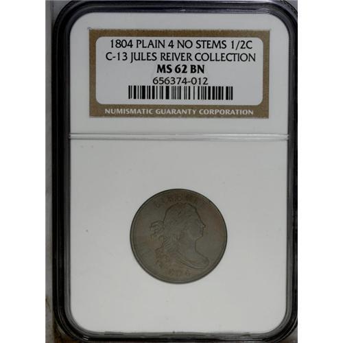 <B>1804<1/2 C> Plain 4, No Stems. C-13, B-10, R.1. Die State 3. MS62 Brown NGC. AU50 EAC.</B></I> Plain 4; Stemless wreath. Although this is a wonderful example for the date or type collector, it will probably sell to a specialist who understands the importance of strike and centering that allows for full viewing of the late state rim break over MER. A splendid example with only a few typical abrasions on either side. The surfaces have excellent cartwheel luster with intermingled chocolate-brown and lustrous tan color, faded from original mint red.<BR><I>Ex: Werl (10/27/1985), lot 15.</B></I> Envelope Included.
