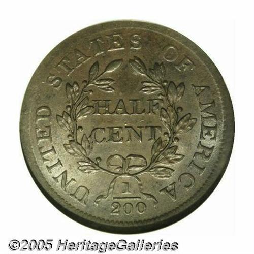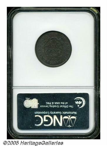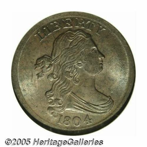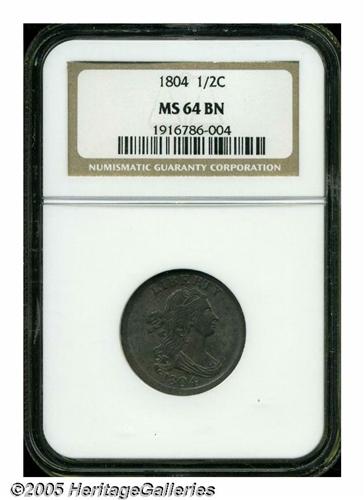 <B>1804<1/2 C> Plain 4, No Stems MS64 Brown NGC.</B></I> B-10, C-13, R.1. Die State 2.0, which has a lack of obverse denticles and a wispy die line in the left obverse field. This attractive, fully lustrous representative exhibits subtle violet undertones and an especially smooth reverse. An always popular issue that is reasonably scarce at the Mint State level. Population: 24 in 64, 8 finer (4/05).