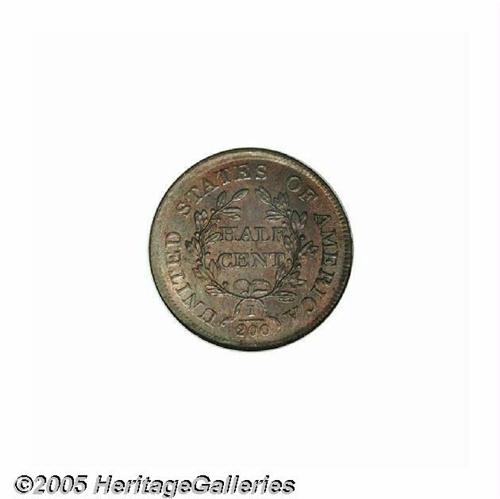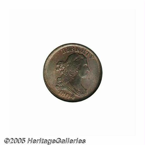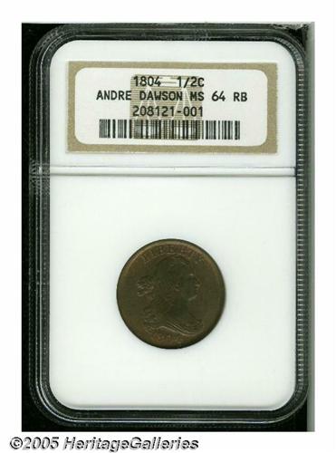 <B>1804<1/2 C> Plain 4, No Stems MS64 Red and Brown NGC.</B></I> B-10, C-13, R.1. Ex: Andre Dawson. Crisply struck on the major devices, the obverse dentils are softly defined, characteristic of the later die state for the variety. Ample original salmon-pink color frequents the borders, while the devices have toned in medium brown hues. Well preserved, a single tiny spot is noted in the field near the chin.<BR><I>Ex: September Long Beach (Heritage, 9/98), lot 5572, which realized $4,255.</B></I>