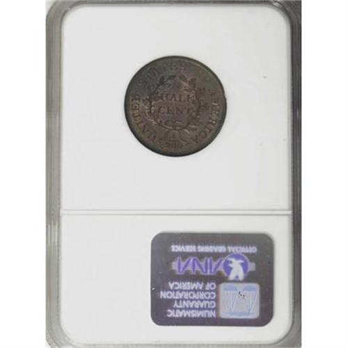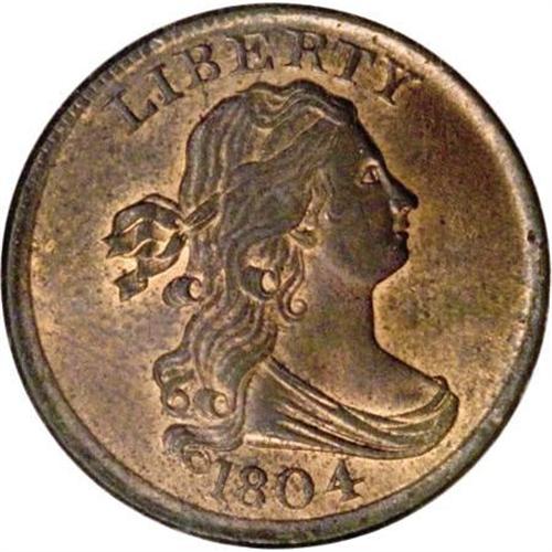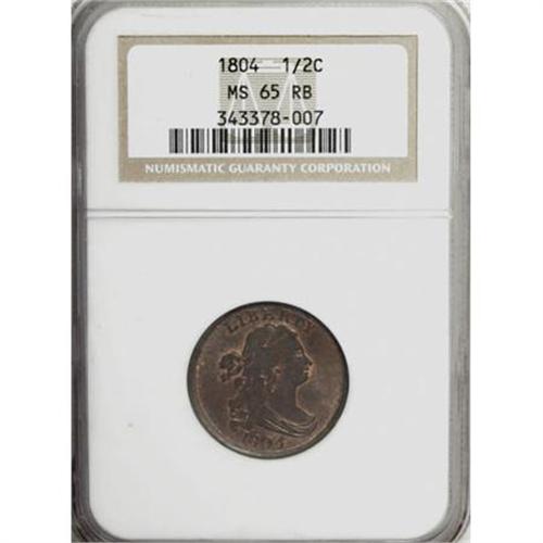 <B>1804 1/2 C Plain 4, No Stems MS65 Red and Brown NGC.</B></I> C-13, B-10, R.1. The Plain 4, No Stems type is the most plentiful of the various 1804 issues in Mint State grades, yet remains elusive with red and brown color. In fact, all Draped Bust large cents are scarce or rare in such preservation, regardless of the date. Even the 1806 C-4 half cent, the most plentiful of the entire type, is seldom seen as nice as this piece.<BR> A delightful example with considerable original orange mint brilliance, blended with pleasing medium brown color, all accompanied by hints of blue and violet iridescence. The design features are nearly full with excellent definition in the drapery and hair, as well as nearly full venation in the wreath. Census: 4 in 65, 1 finer (12/07). EAC 63.<BR><I>From The Madison Collection.</B></I><BR><BR><B>Coin Engraver:</B> Robert Scot<BR><BR><b>Shipping:</b> Coins & Currency (<a target="_blank" href="http://www.heritageauctions.com/common/shipping.php">view shipping information</a>)