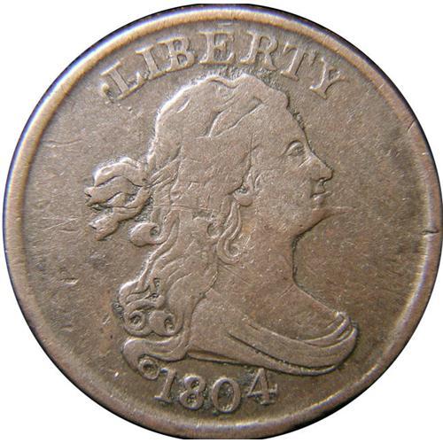 <B>1804<1/2 C> Spiked Chin--Scratched--ANACS. VF20 Details.</B></I> C-7, B-5, R.4. Manley Die State 6.0. The reverse rim break joins the tops of OF and just misses the top of A. Two Spiked Chin varieties have extensive reverse rim breaks, both providing a variety of highly collectible die states. The other marriage, Cohen-6, is quite common while this variety is scarce. Only about 10 examples from the estimated population of 125 coins are in this die state. Pleasing dark olive surfaces display minor obverse scratches. Both sides have minor verdigris that could be easily removed. EAC 10.