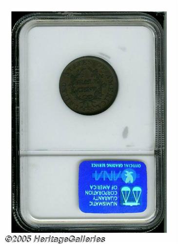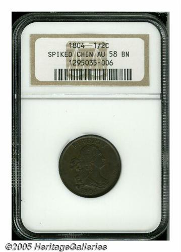 <B>1804<1/2 C> Spiked Chin AU58 NGC.</B></I> B-7, C-8, R.1. 1804 is one of the few years for which Half Cents are more prevalent than their bigger sisters. A loose bolt, struck into the die, is a prominent theory for the curious 'Spiked Chin' variety. A deep golden-brown example, evenly struck and surprisingly unabraded with only a trace of verdigris on the reverse.