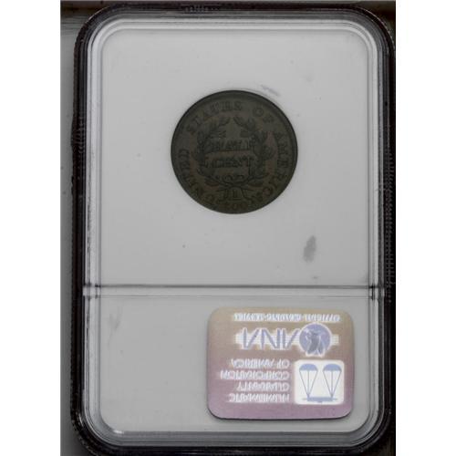 <B>1804<1/2 C> Spiked Chin AU58 NGC.</B></I> C-8, B-7, R.1. 1804 is one of the few years for which half cents are more prevalent than their bigger sisters. A loose bolt, struck into the die, is a prominent theory for the curious 'Spiked Chin' variety. A deep golden-brown example, evenly struck and surprisingly unabraded with only a trace of verdigris on the reverse. EAC 45.