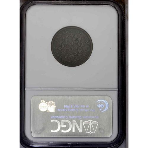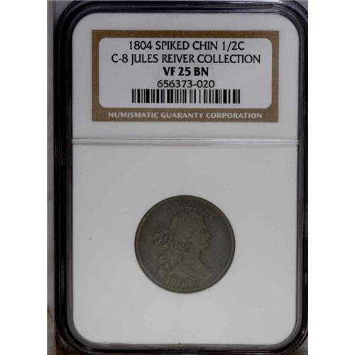 <B>1804<1/2 C> Spiked Chin. C-8, B-7, R.1. Die State 3. VF25 NGC. Fine 12 EAC.</B></I> Spiked Chin; Close fraction, ridge at R. For the date or type collector, this is the variety of choice, for it is clearly the most plentiful of the Spiked Chin die marriages, and it is available in a wide range of grades. This example is from a common die state with a light crack through the tops of LIBERTY, although it is extremely faint between T and Y. The dies have been lapped, removing dentilation from either side. Olive and mahogany surfaces have lighter tan color on the devices. The surfaces are minutely granular with a few old scratches in the left obverse field. Overall, it is an attractive and desirable example with the die injury on the obverse complete, although a little weak. Envelope Included.