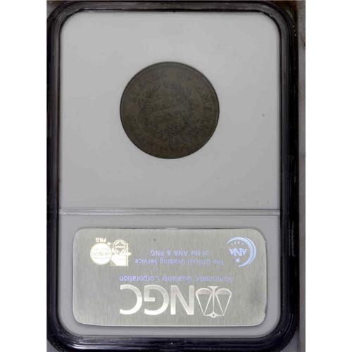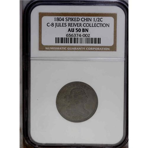 <B>1804<1/2 C> Spiked Chin. C-8, B-7, R.1. Die State 6. AU50 NGC. VF25 EAC.</B></I> Spiked Chin; Close fraction, ridge at R. Apparently the latest die state known, and similar to that in the next lot. Breen recorded two later die states, but no examples of either are known to specialists today. A retained cud extends from the left edge of the upright of L to the extreme left serif of R, but it does not encroach on that letter. Breen had described this as a rim break, although the existence of the raised ridge forming the rim above these letters is the defining aspect of a retained cud and not a full break in this area. Lovely chestnut and light brown surfaces with only the typical minor abrasions encountered for the grade. Jules recorded that this example is from the 1990 EAC Sale, lot 45, but it is actually from the 1991 EAC Sale. Breen Die State VII.<BR><I>Ex: Harry Laibstain (2/1989); Jim McGuigan; Early American Coppers Sale (4/1991), lot 45. </B></I> Envelope Included.