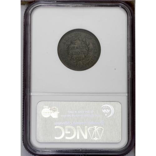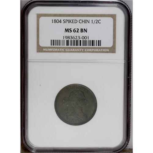 <B>1804<1/2 C> Spiked Chin MS62 Brown NGC.</B></I> C-8, B-7, R.1. One in a progression of Mint State grades offered of this sought-after variety. Both sides exhibit rich violet-brown color, lightening somewhat inside the wreath due to shallow planchet laminations. EAC 55. <BR><BR><B>Important notice:</B> Heritage usually auctions material at the rate of 200-250 lots per hour. On some occasions eBay Live bid software or the Internet may not be able to keep up with the pace of the auction. We recommend placing a realistic absentee bid now as insurance to avoid disappointment. Occasionally the auctioneer may eliminate or reject an eBay Live bid, and the auctioneer may also reopen a lot after the close of the eBay live bidding (usually because we missed an audience bid), and may reject your bid even if it shows you as the winning bidder. By bidding via eBay Live, you agree that Heritage may award the lot to another bidder at its sole discretion under the circumstances described above or any other reasonable circumstances. Since eBay bids are not shown to us until we open the lot on the floor, we treat those bids just like floor bids. In most cases the floor responds before the eBay bid is presented to us, due to Internet lag time, so for consistency we have made it a policy that floor bids are always considered first over tie eBay live bids. Also please note that all Heritage lots purchased through eBay Live carry a 20% Buyer's Premium. Please make sure you read the Terms and Conditions before you bid. This lot is being auctioned in conjunction with a live floor auction by Heritage Galleries & Auctioneers. All final auction and invoice information will be supplied by Heritage Galleries & Auctioneers, and all other information should be considered preliminary. Lot:213 <BR><BR><B>Winning Notification and Billing:</B> After the FINAL session in this auction is complete, Heritage will send e-mail and snail mail invoices. This process normally takes several days. All final auction and invoice information will be supplied by Heritage Galleries & Auctioneers, and all other information should be considered preliminary. <BR><BR>This auction will be conducted on a live auction floor and over the Internet through eBay Live. If you choose to place an absentee bid, please take a moment to <font color='#0000ff'><u><a href='http://pages.ebay.com/liveauctions/help/before/laabsentee.html'>learn how eBay Live absentee bidding works</a></u></font><font color='#000000'>
