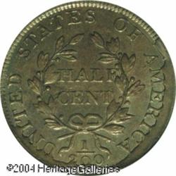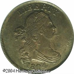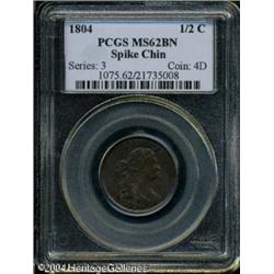 1804 1/2 C Spiked Chin MS62 Brown PCGS. B-6, C-6, <B>1804 1/2 C Spiked Chin MS62 Brown PCGS.</B></I> B-6, C-6, R.2. Manley Die State 12.0, "Very Rare." A retained cud is above the O in OF on this important late die state. Dr. Manley opines in his <I>Half Cent Die State Book,</B></I> "less than a half dozen Mint State specimens are known for this variety. Most die states are available only in Very Fine and lower grades." Sea-green and chocolate-brown patina graces this shimmering piece, which is clean for the grade although a shallow planchet flaw (as struck) is above the C in CENT. Of all Half Cent varieties, Cohen-6 is the most popularly collected by die state because of its dramatic die breaks along the reverse periphery. <BR><BR><B>Important notice:</B> Heritage usually auctions material at the rate of 200-250 lots per hour. On some occasions eBay Live bid software or the Internet may not be able to keep up with the pace of the auction. We recommend placing a realistic absentee bid now as insurance to avoid disappointment. Occasionally the auctioneer may eliminate or reject an eBay Live bid, and the auctioneer may also reopen a lot after the close of the eBay live bidding (usually because we missed an audience bid), and may reject your bid even if it shows you as the winning bidder. By bidding via eBay Live, you agree that Heritage may award the lot to another bidder at its sole discretion under the circumstances described above or any other reasonable circumstances. Since eBay bids are not shown to us until we open the lot on the floor, we treat those bids just like floor bids. In most cases the floor responds before the eBay bid is presented to us, due to Internet lag time, so for consistency we have made it a policy that floor bids are always considered first over tie eBay live bids. Also please note that all Heritage lots purchased through eBay Live carry a 20% Buyer's Premium. Please make sure you read the Terms and Conditions before you bid. This lot is being auctioned in conjunction with a live floor auction by Heritage Galleries & Auctioneers. All final auction and invoice information will be supplied by Heritage Galleries & Auctioneers, and all other information should be considered preliminary. Lot:5017