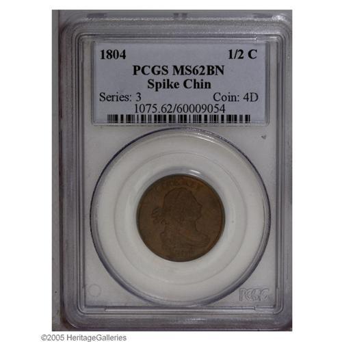 1804 1/2 C Spiked Chin MS62 Brown PCGS. B-7, C-8, R.1. 1804[1/2 C] Spiked Chin MS62 Brown PCGS.