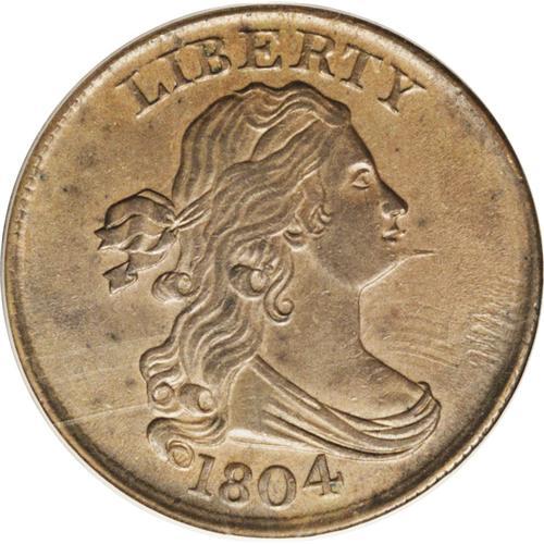 <B>1804 1/2 C Spiked Chin MS63 Brown PCGS.</B></I> C-8, B-7, R.1. Lightly cracked through the top of LIBERTY. Pleasing golden-tan patina covers nicely preserved surfaces, and the design elements are well centered and sharply impressed, with nice definition apparent in Liberty's hair and on her drapery. The ribbing is visible in most of the reverse leaves. All in all, a nice spiked chin representative. EAC 50. Population: 10 in 63, 4 finer (10/06).<BR><BR><b>Shipping:</b> Coin/Currency (<a target="_blank" href="http://www.heritageauctions.com/common/shipping.php">view shipping information</a>)