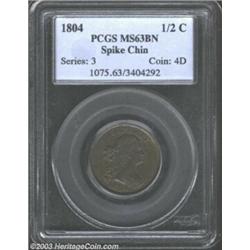 <TR><TD width="100%"><TABLE cellSpacing=1 cellPadding=3 width="100%" border=0><TBODY><TR><TD width="100%" bgColor=#79735c><FONT face=arial color=#ffffff size=3><B>Description</B> </FONT></TD></TR><TR><TD width="100%" bgColor=#ffffff><FONT face=arial size=2><B>1804 1/2 C Spiked Chin MS63 Brown PCGS.</B></I> B-7, C-8, R.1. Manley Die State 3.0. The denticles on the long-lived obverse die are absent, as made due to a polished die. A boldly struck representative with lilac and honey-brown colors. The lower left obverse has a faint handling mark, but the surfaces are otherwise clean. Population: 7 in 63, 3 finer (4/03).<BR><I>From the Gary G. Walker Collection.</B></I> </FONT></TD></TR></TBODY></TABLE></TD></TR></TBODY></TABLE><BR><A name=PricesRealized></A><TABLE cellSpacing=0 cellPadding=0 width="100%" bgColor=#000000 border=0><TBODY><TR><TD width="100%"><TABLE cellSpacing=1 cellPadding=3 width="100%" border=0><TBODY><TR><TD width="100%" bgColor=#79735c><A name=PR><FONT face=arial color=#ffffff size=3><B>Previous Prices from Heritage Auctions</B> </FONT></A></TD></TR><TR><TD bgColor=#f6f6ed><TABLE cellSpacing=0 cellPadding=0 width="100%" border=1><TBODY><TR><TD align=middle width="33%"><B>Date</B></TD><TD align=middle width="33%"><B>Service</B></TD><TD align=middle width="33%"><B>Price</B></TD></TR><TR bgColor=whitesmoke><TD width="33%"><B>08/13/1999</B></TD><TD width="33%">PCGS</TD><TD width="33%">$2,070.00</TD></TR></TBODY></TABLE></TD></TR><TR><TD bgColor=#ffffff><FONT face=arial size=1 ?>PLEASE NOTE: All prices realized reflect the final hammer price PLUS the buyer's premium in auctions that charge a buyer's premium. Each item has a notation at the top of the listing indicating whether that lot included a buyer's premium. Example: A item that sells with a final hammer price of $100 and a 20% buyer's premium will display with a price realized of $120. All information listed is intended to be as accurate as possible, but errors are possible. Please use this guide carefully and inform us of any inaccuracies. </FONT></TD></TR></TBODY></TABLE></TD></TR></TBODY></TABLE><BR><TABLE cellSpacing=0 cellPadding=0 width="100%" bgColor=#000000 border=0><TBODY><TR><TD width="100%"><TABLE cellSpacing=1 cellPadding=3 width="100%" border=0><TBODY><TR><TD width="100%" bgColor=#79735c colSpan=6><FONT face=arial color=#ffffff size=3><B>Price Guide*</B> </FONT></TD></TR><TR bgColor=#f6f6ed><TD align=middle><B>Grade</B> </TD><TD align=middle><B>Coin World<BR>(Trends)</B> </TD><TD align=middle><B>Numismedia<BR>Retail</B> </TD><TD align=middle><B>Numismedia<BR>Wholesale</B> </TD><TD align=middle><B>Coin<BR>Universe</B> </TD><TD align=middle><B>Heritage<BR>Value Index</B> </TD></TR><TR bgColor=#ffffff><TD align=middle>62</TD><TD align=right>---</TD><TD align=right>---</TD><TD align=right>$1,575.00</TD><TD align=right>---</TD><TD align=right>$1,132.50</TD></TR><TR style="FONT-WEIGHT: bold" bgColor=#cccfdd><TD align=middle>63</TD><TD align=right>---</TD><TD align=right>---</TD><TD align=right>$2,500.00</TD><TD align=right>---</TD><TD align=right>$1,395.00</TD></TR><TR bgColor=#ffffff><TD align=middle>64</TD><TD align=right>---</TD><TD align=right>---</TD><TD align=right>---</TD><TD align=right>---</TD><TD align=right>$2,430.00</TD></TR><TR bgColor=#ffffff><TD colSpan=6><FONT size=1>*All information listed is intended to be as accurate as possible, but errors are possible. No item may be returned or refused based on this information which is provided as a service to our customers. You should contact each pricing source directly to determine the accuracy of this information. </FONT></TD></TR></TBODY></TABLE></TD></TR></TBODY></TABLE><BR><TABLE cellSpacing=0 cellPadding=0 width="100%" bgColor=#000000 border=0><TBODY><TR><TD width="100%"><TABLE cellSpacing=1 cellPadding=3 width="100%" border=0><TBODY><TR><TD width="100%" bgColor=#79735c><FONT face=arial color=#ffffff size=3><B>Population Guide</B> </FONT></TD></TR><TR bgColor=#ffffff><TD align=middle><!-- Begin Output of Population Grid--><TABLE cellSpacing=0 cellPadding=0 width="100%" border=0><TBODY><TR><TD vAlign=center><TABLE cellSpacing=0 width="100%" border=1 cellsadding="3"><TBODY><TR><TD vAlign=center><TABLE cellSpacing=0 cellPadding=3 width="100%" border=1><TBODY><TR><TD vAlign=center align=middle bgColor=#f0f1e8 colSpan=2 <CENTER><FONT face=Arial size=2><B>PCGS Pop </B></FONT><CENTER></CENTER></TD><TD vAlign=center align=middle bgColor=#f0f1e8 colSpan=2><CENTER><FONT face=Arial size=2><B>NGC Pop</B></CENTER></FONT></TD></TR><TR><TD vAlign=center><FONT face=Arial size=2>(63)</FONT> </TD><TD vAlign=center align=right><FONT face=Arial size=2>7</FONT> </TD><TD vAlign=center><FONT face=Arial size=2>(63)</FONT> </TD><TD vAlign=center align=right><FONT face=Arial size=2>5</FONT> </TD></TR><TR><TD vAlign=center><FONT face=Arial size=2>(>63)</FONT> </TD><TD vAlign=center align=right><FONT face=Arial size=2>3</FONT> </TD><TD vAlign=center><FONT face=Arial size=2>(>63)</FONT> </TD><TD vAlign=center align=right><FONT face=Arial size=2>2</FONT> </TD></TR></TBODY></TABLE></TD></TR></TBODY></TABLE></TD></TR></TBODY></TABLE><!-- End Output of Population Grid--></TD></TR></TBODY></TABLE></TD></TR></TBODY></TABLE><BR><TABLE cellSpacing=0 cellPadding=0 width="100%" bgColor=#000000 border=0><TBODY><TR> Important notice: We expect to be auctioning lots at the rate of 200-250 per hour. On occasion eBay live bid software cannot keep up with the pace of the auctions where 4-5 lots per minute can hammer down, so we recommend that you place a realistic absentee bid now as insurance to avoid disappointment. Also please note that all Heritage/CAA lots purchased through eBay Live carry a 20% Buyer's Premium. Please make sure you read the Terms and Conditions.