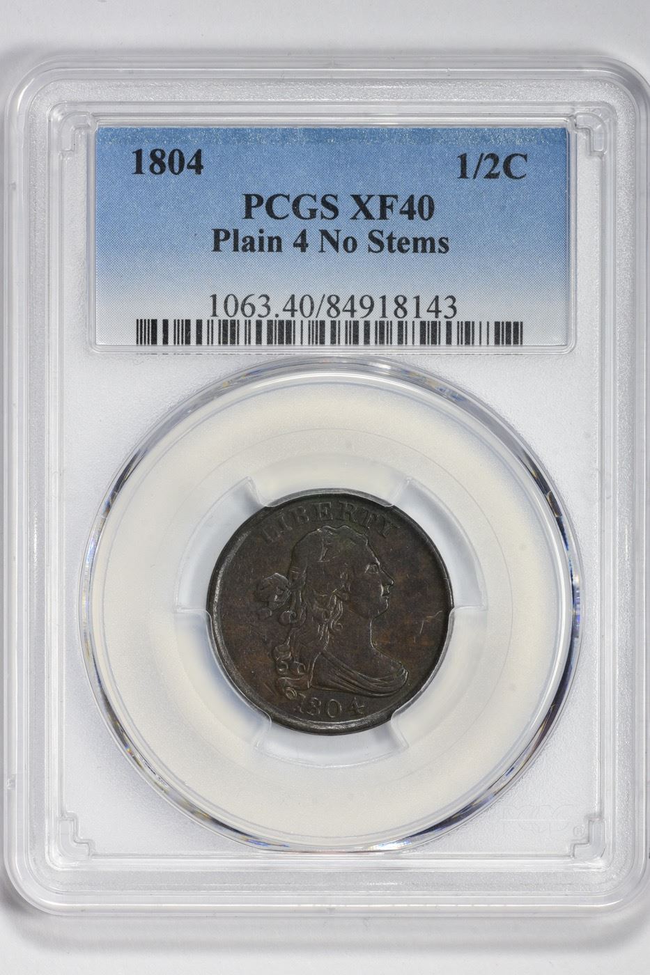 1804 1/2C Half Cent Plain 4, No Stems. XF 40 PCGS