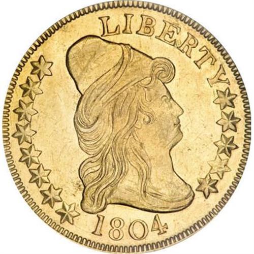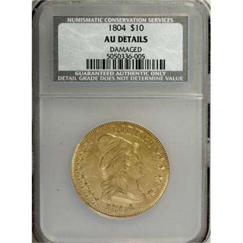 <B>1804 $10 Crosslet 4--Damaged--NCS. AU50 Details.</B></I> Breen-6847, Taraszka-31, BD-1, High R.4. The Crosslet 4 die marriage is the only pairing for business strikes of the year, as the proof 1804 eagles, for example in the King of Siam and other presentation proof sets, have the Plain 4 obverse, a die that was produced in 1834 or 1835, or both. This makes the present variety the only 1804 eagle widely available to collectors. The obverse of this coin appears to have been subtly bent and straightened, and there is some light scraping on the upper right shield area on the reverse. A die crack passes through stars 1 and 2 and the 180 in the date. Some small patches of die rust are noted, and light adjustment marks appear on Liberty's portrait. This is still a much nicer coin than it sounds from the technical description, with good eye appeal and an original look, if not without some minor distractions.<BR><BR><B>Coin Engraver:</B> Robert Scot<BR><BR><b>Shipping:</b> Coins & Currency (<a target="_blank" href="http://www.heritageauctions.com/common/shipping.php">view shipping information</a>)