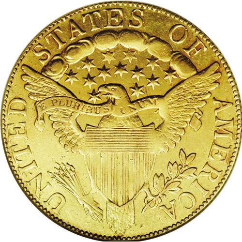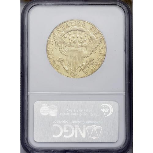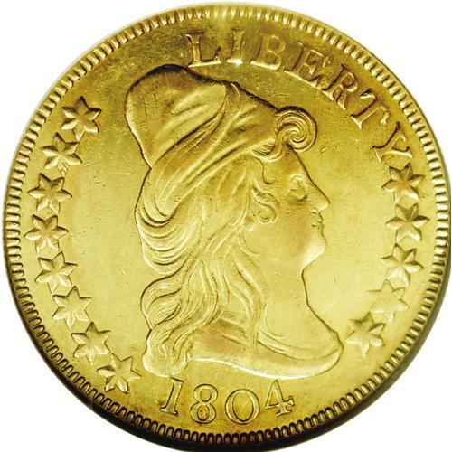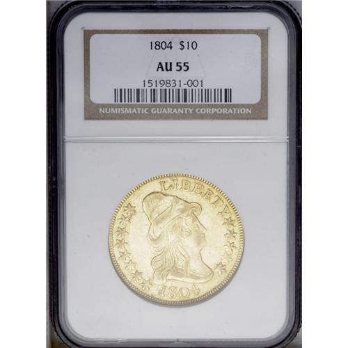 <B>1804<$10> Crosslet 4 AU55 NGC.</B></I> Breen-6847, B. 1-A, Taraszka-31, R.4. The final year of the type, the 1804 is rarer than its 3,757 mintage figure suggests. It is estimated that a little over 1% of the two deliveries (December 28 and 31, 1804) have survived. NGC and PCGS have, to date, certified around 81 specimens, several of which are likely resubmissions.<BR> This Choice AU example displays bright, yellow-gold surfaces that retain luster in some of the recessed areas. The design elements are well centered on the planchet, and the obverse dentilation is bold, while that on the reverse is a trifle less so. With the exception of minor softness in Liberty's eye and mouth, her features are nicely brought up, much more so than is typical for this issue. The date is bold, and most of the star centers are strong. The reverse elements are generally well defined, though some softness is apparent on the eagle's neck and right (left facing) claw and adjacent arrow shafts, and on the upper right (facing) part of the shield and adjacent feathers. A few wispy slide marks are noted on the obverse, and light mint-made vertical adjustment marks are visible on the cap.