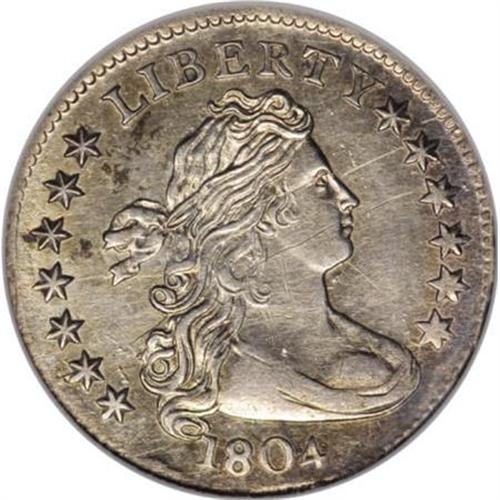 1804 10C 13 Stars on Reverse--Scratched--ANACS. AU55 Details. JR-1, R.5. This is an extraordinary and extraordinarily well-provenanced example of this rare variety. It last appeared as lot 1595 in ANR's March 2005 sale of the Richard Jewell collection, uncertified and graded AU55 with light scratches. The excellent description from that auction reads, in part:<BR><BR>"Luminous bright silver gray with subtle peripheral toning on the obverse consisting of mostly golden tones while the reverse shows even more delicate peripheral toning, highlighted by an area of pale blue over AMERICA. Two parallel old scratches cross the portrait, one leaving the right obverse field at Liberty's eye and the other crossing her lips below, and short tails of them are clear behind her hair. These scratches were described almost every time the coin has sold since Parmelee, and their notice in that 1890 catalogue enable us to accurately connect this coin with one of the finest pedigrees in all of numismatics. Some light hairlines and a thin diagonal scratch through the star cluster are also noted. This coin boasts one of the finest strikes seen on an 1804 dime, with a fully detailed portrait bust of Liberty and ideal definition on the eagle. This coin was fine enough to serve to represent the variety in no less than three of the great dime collections--Bareford, Lovejoy, and Bolen--not to mention the great comprehensive cabinets formed by Parmelee and Newcomer."<BR><BR>Indeed, the assigned details grade for this coin may be on the conservative side, as a mere touch of wear can be seen on the high points of Liberty's bustline and the eagle's head. A good deal of luster remains, granting this piece the eye appeal that must have drawn so many renowned collectors to own it over the last hundred-plus years. Clearly, it is among the finest known of the variety, since the major grading service have certified no Thirteen Stars dimes in Mint State and only three in any AU grade. By becoming the high bidder on this storied coin, you have the opportunity to follow in some rarefied numismatic footsteps.<BR> <I>Ex: Parmelee Collection (New York Coin and Stamp Co., 8/1890, lot 819); Waldo C. Newcomer collection; unknown intermediaries; Norman Schultz (1/49, lot 1023); Harold Bareford Collection (Stack's, 10/81, lot 149); Allen F. Lovejoy Collection (Stack's, 10/90, lot 26); Waldo Bolen Collection (RARCOA Numisma '95, 11/95, lot 2018); Richard Jewell Collection (ANR, 3/05, lot 1595). The holder from the Numisma '95 sale accompanies this lot.<BR></B></I><BR><BR><BR><B>Coin Engraver:</B> Robert Scot<BR><BR><b>Shipping:</b> Coins & Currency (<a target="_blank" href="http://www.heritageauctions.com/common/shipping.php">view shipping information</a>)